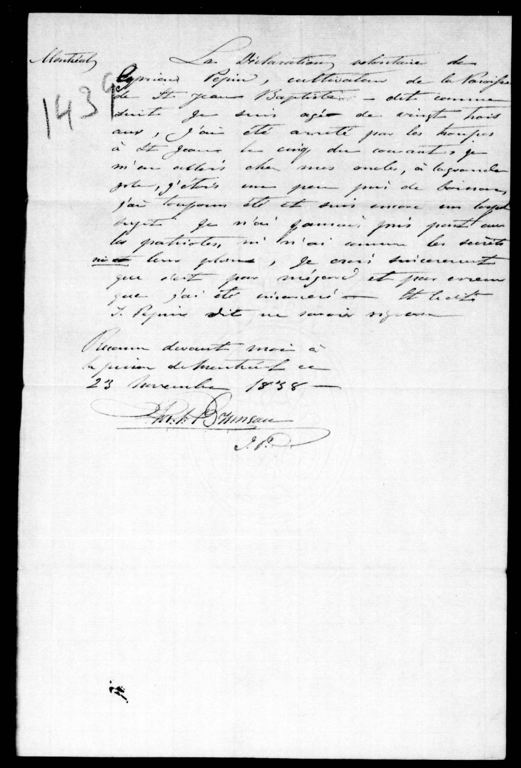Examen de Cyprien Pepin, cultivateur de Saint-Jean-Baptiste-de-Rouville, 23 novembre 1838, Archives nationales à Québec, Fonds Ministère de la Justice, (03Q,E17,S37,D1439).