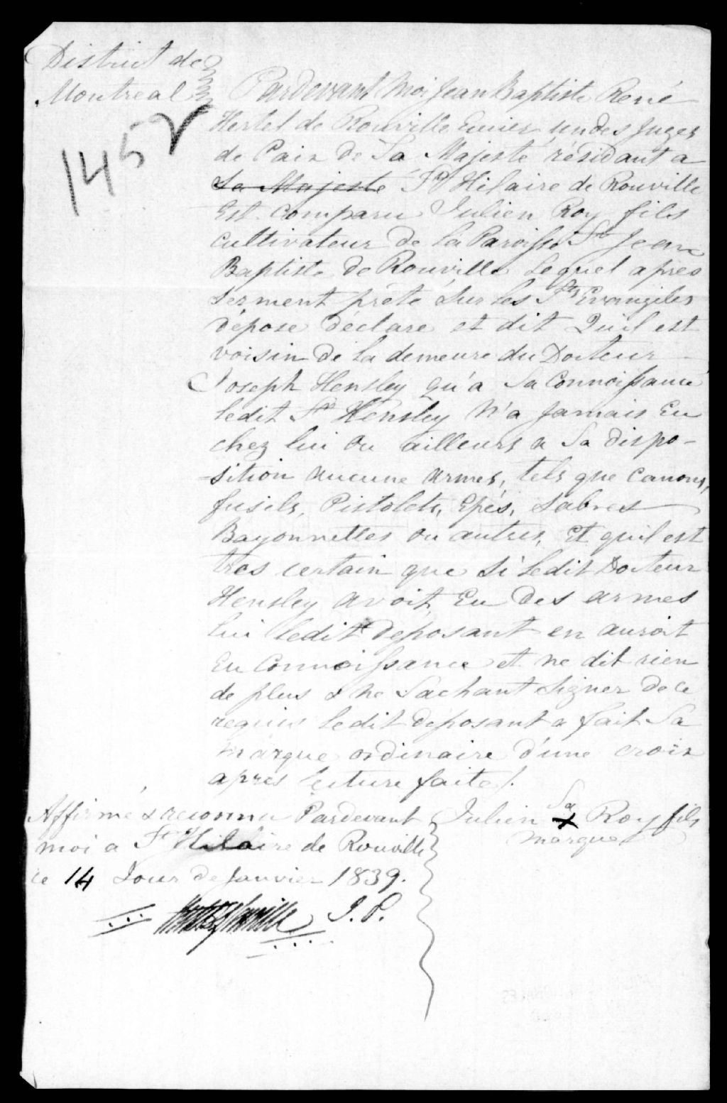 Déposition de Julien Roy fils, cultivateur de Saint-Jean Baptiste de Rouville