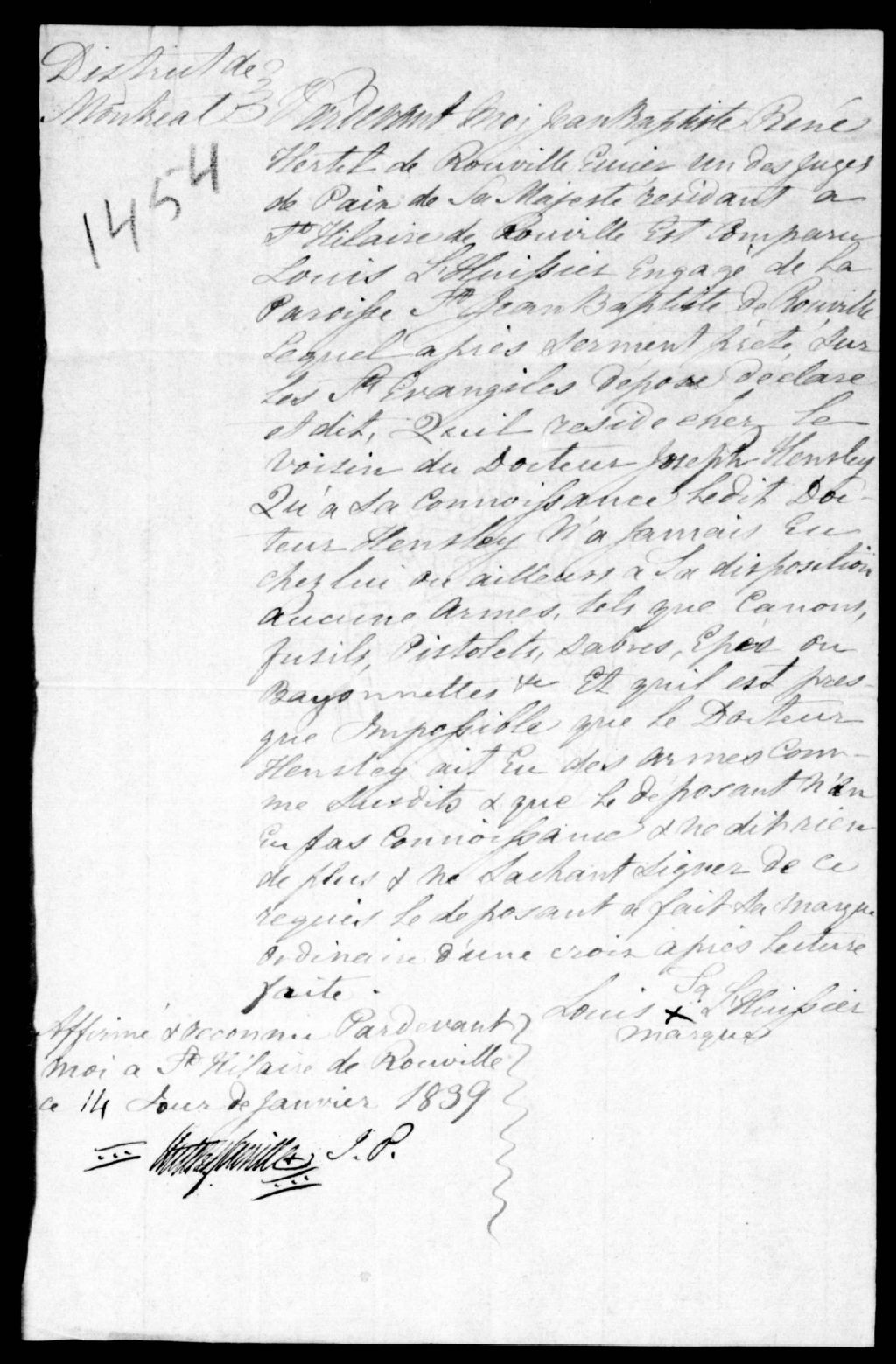Déposition de Louis L'Huissier, de Saint-Jean Baptiste de Rouville, 14 janvier 1839, Archives nationales à Québec, Fonds Ministère de la Justice, (03Q,E17,S37,D1454).