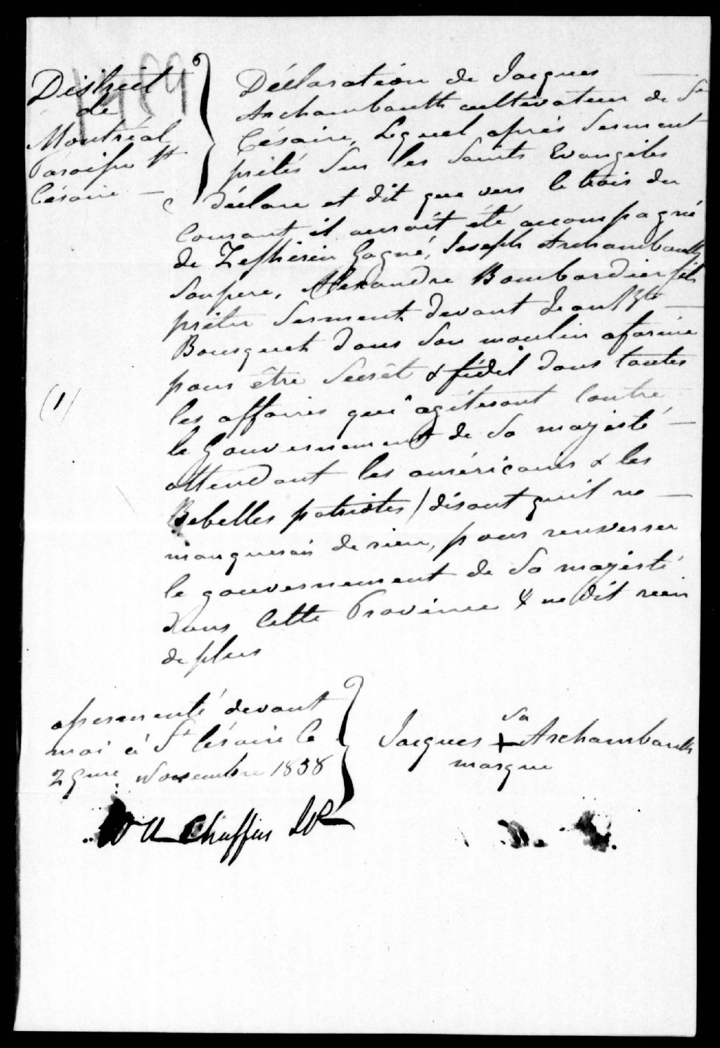 - Déposition de Jacques Archambault, cultivateur, de Saint-Césaire, contre Jean Baptiste Bousquet