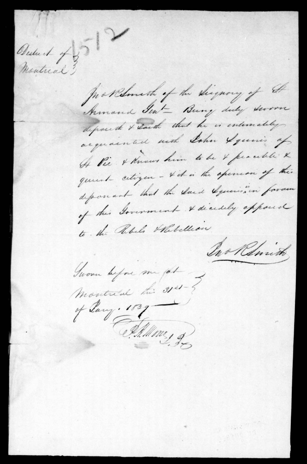 Affidavit en faveur de John R. Smith, de la Seignerie St-Armand, 31 janvier 1839, Archives nationales à Québec, Fonds Ministère de la Justice, (03Q,E17,S37,D1512).