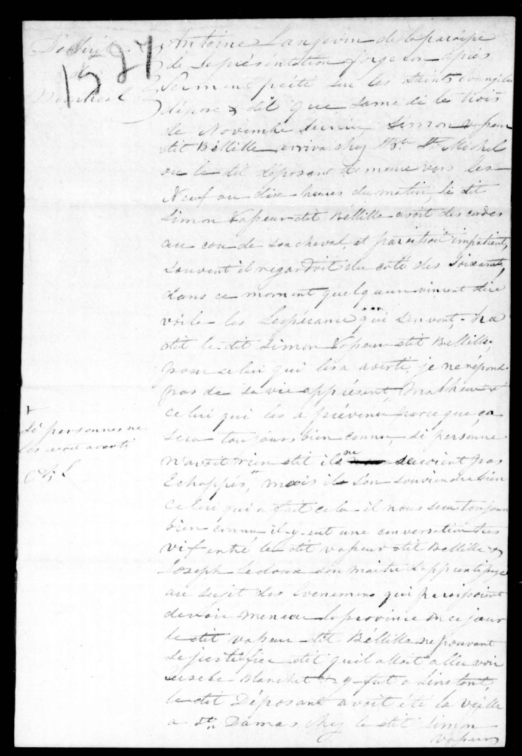 Déposition d'Antoine Langevin, forgeron, de la Présentation, contre Simon Vasseur dit Belleville, 8 décembre 1838, Archives nationales à Québec, Fonds Ministère de la Justice, (03Q,E17,S37,D1527).