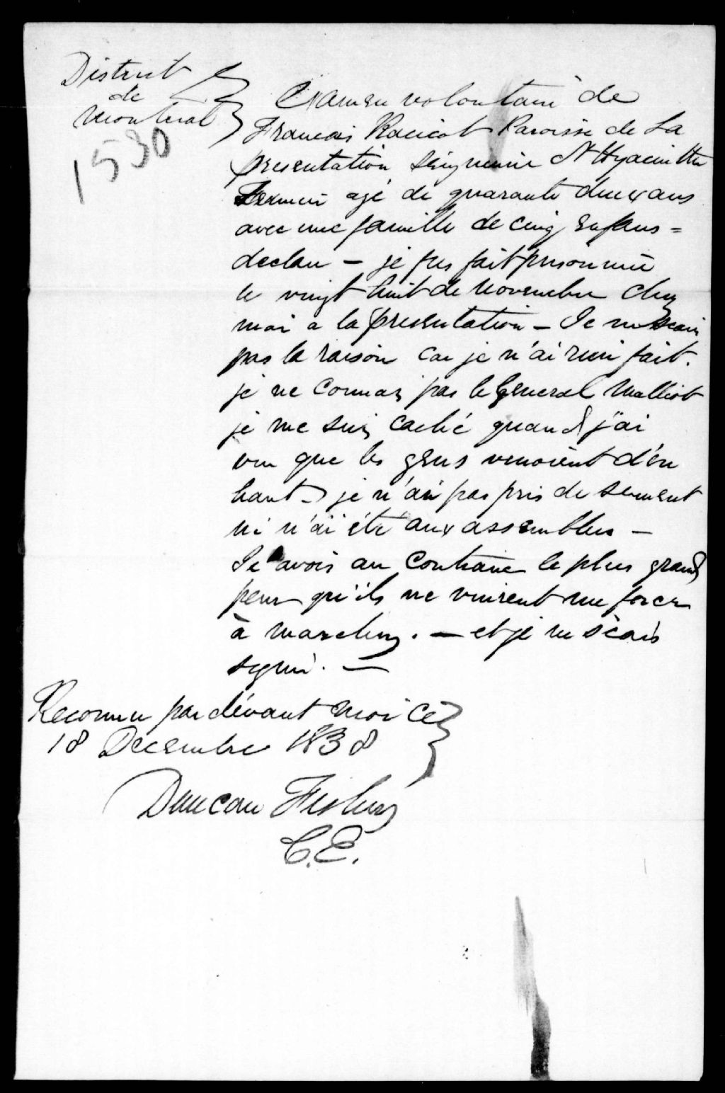 Examen de François Racicot, de la Présentation, 18 décembre 1838, Archives nationales à Québec, Fonds Ministère de la Justice, (03Q,E17,S37,D1530).