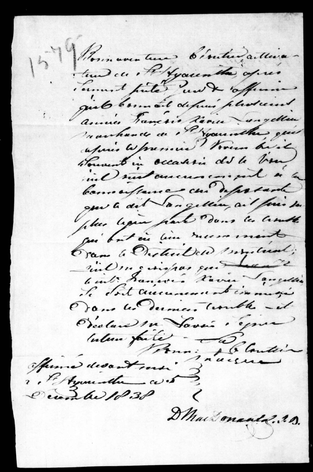 Déposition de Bonaventure Cloutier, cultivateur, de Saint-Hyacinthe, en faveur de François-Xavier Langelier, marchand, de Saint-Hyacinthe, 5 décembre 1838, Archives nationales à Québec, Fonds Ministère de la Justice, (03Q,E17,S37,D1579).