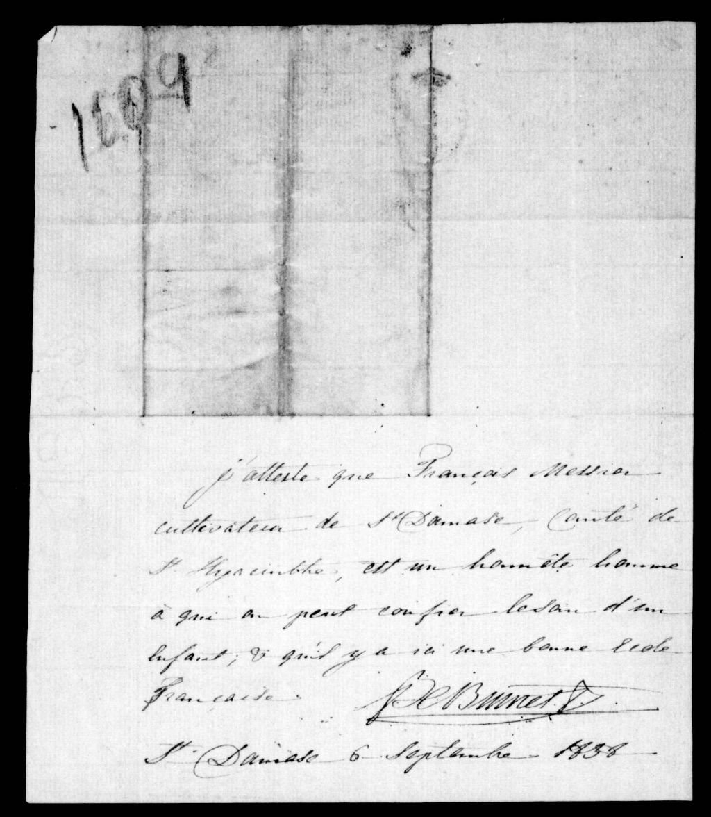 - Certificat de messire F.-X. Brunet, curé de Saint-Damase, en faveur de François Messier