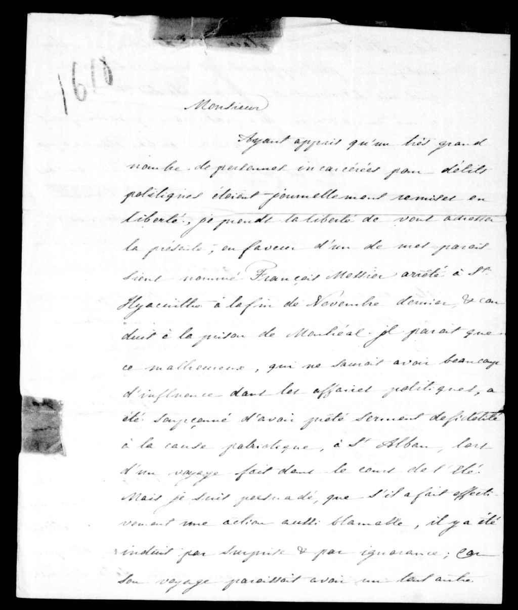 Lettre datée de Saint-Damase par F.-X. Brunet, prêtre-curé, à Charles Richard Ogden, procureur général, 7 janvier 1838, Archives nationales à Québec, Fonds Ministère de la Justice, (03Q,E17,S37,D1610).