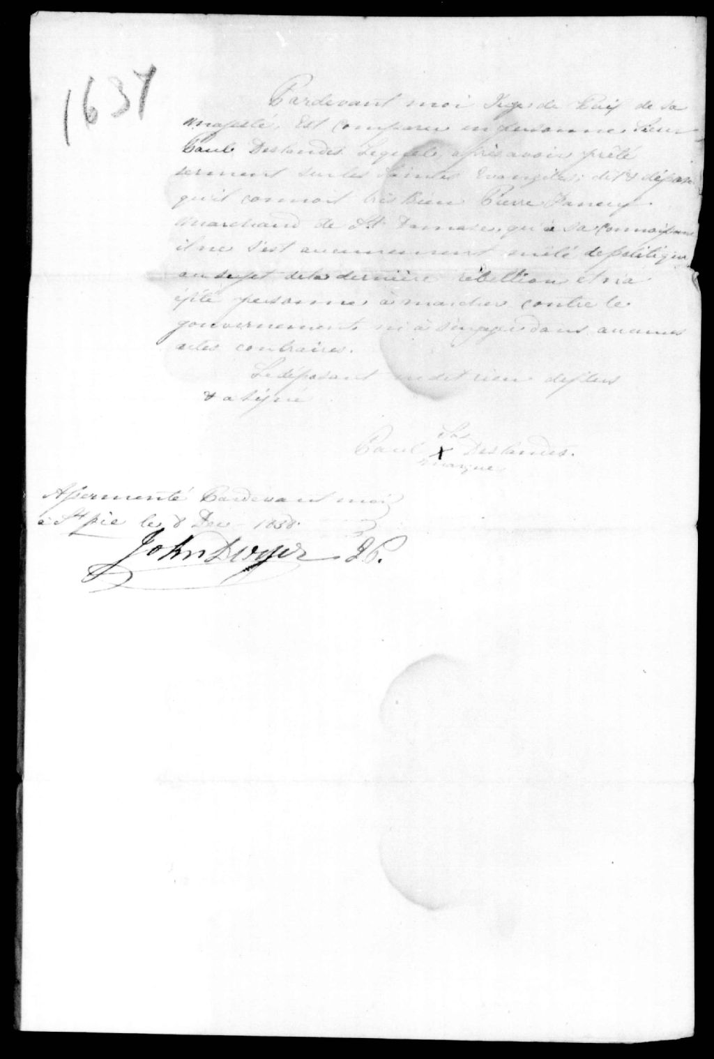 Déposition de Pierre Deslandres en faveur de Pierre Phaneuf, 8 décembre 1838, Archives nationales à Québec, Fonds Ministère de la Justice, (03Q,E17,S37,D1637).