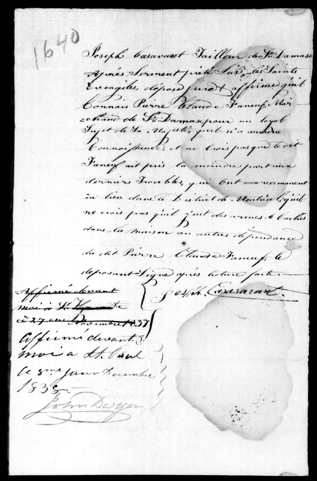 Déposition de Joseph Casavant, tailleur, de Saint-Damase, en faveur de Pierre-Claude Phaneuf, 8 décembre 1838, Archives nationales à Québec, Fonds Ministère de la Justice, (03Q,E17,S37,D1640).