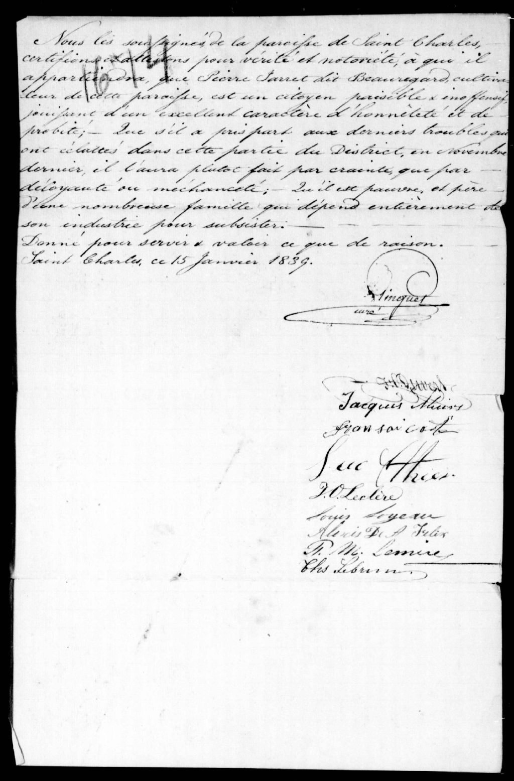 Certificat de loyauté en faveur de Pierre Jarret dit Beauregard, signé par Pinguet, curé de Saint-Charles, et Charles Lebrun, F.M.Lemire, J.O.Leclerc (Leclère), François Côté et autres, 15 janvier 1839, Archives nationales à Québec, Fonds Ministère de la Justice, (03Q,E17,S37,D1674).