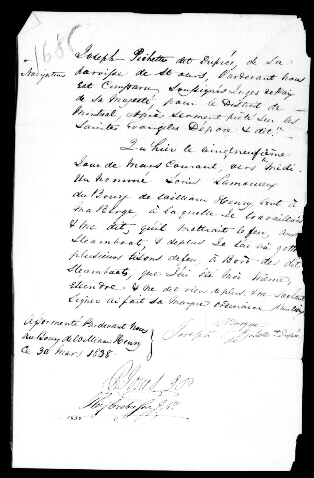 Déposition de Joseph Pichette dit Duprés, Saint-Ours, contre Louis Lamoureux, de William-Henry