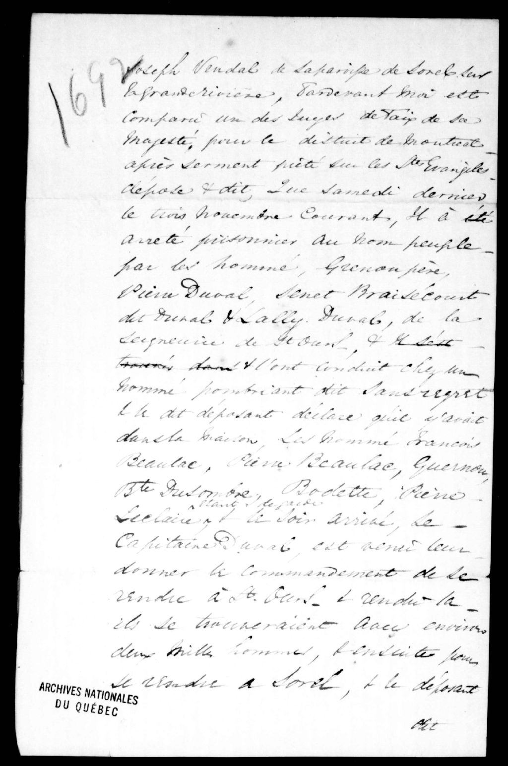 Déposition de Joseph Vandal, de Sorel, contre Grenon, père, Pierre Duval, Senet, Braisecourt dit Duval, Lally Duval, tous de Saint-Ours et autres
