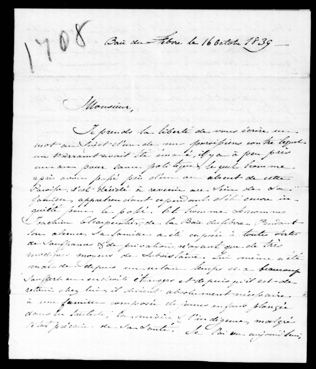 Lettre de Michel Carrier, curé de la Baie-Saint-Antoine, au lieutenant-colonel Hanson, magistrat du district de Trois-Rivières