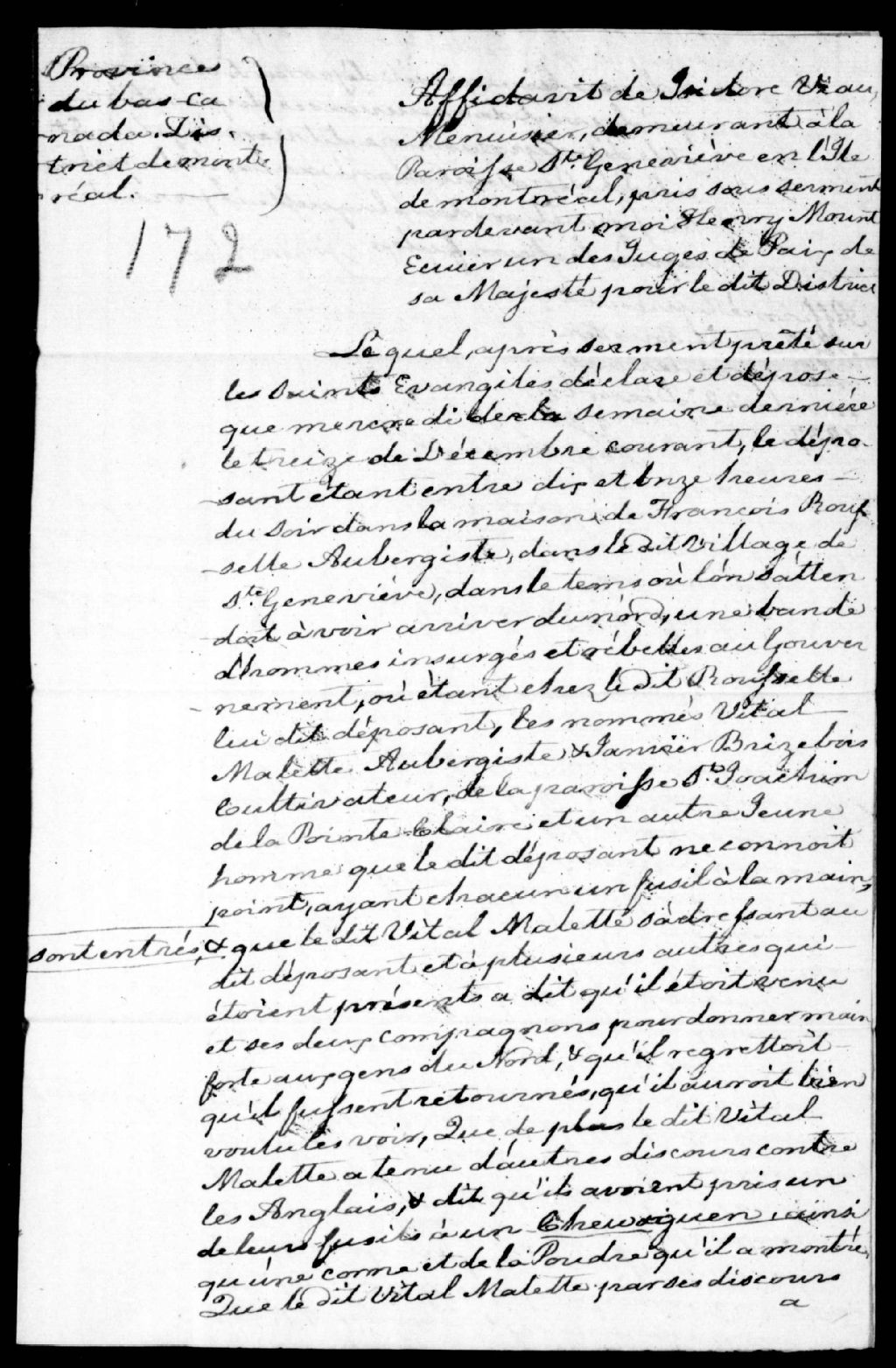 - Affidavit d'Isidore Viau, de Sainte-Geneviève, contre Vital Mallette, Janvier Brisebois et autres