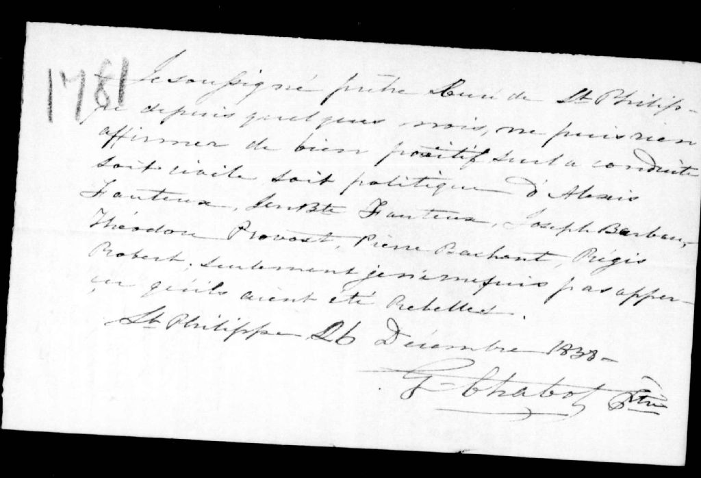 Certificat de loyauté en faveur d'Alexis Fauteux, Jean-Baptiste Fauteux, Joseph Barbeau, Théodore Prévost, Pierre Bachant et Régis Robert, de Saint-Philippe, de Grégoire Chabot, prêtre, 26 décembre 1838, Archives nationales à Québec, Fonds Ministère de la Justice, (03Q,E17,S37,D1781).