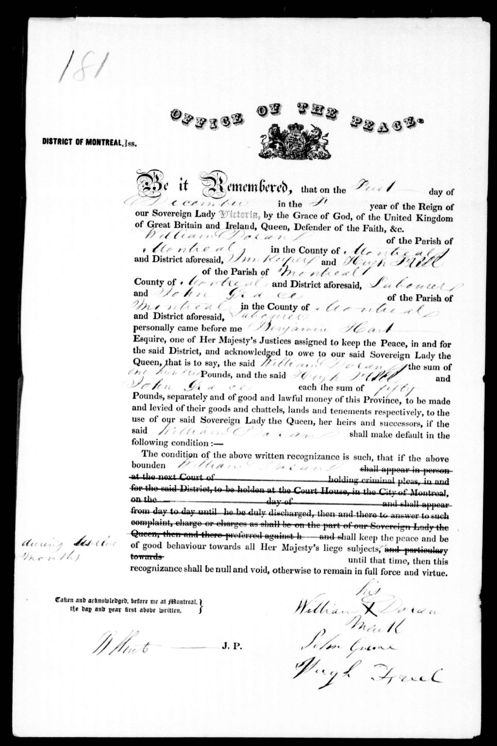 Reconnaissance de William Doran, de Montréal, 1 décembre 1837, Archives nationales à Québec, Fonds Ministère de la Justice, (03Q,E17,S37,D181).