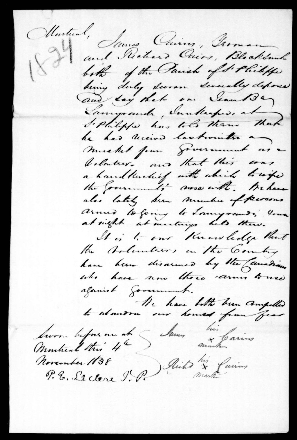 Déposition de James Cairns et de Richard Cairns, forgeron, de Saint-Philippe, contre Jean-Baptiste Lamirande, de Saint-Philippe, 4 novembre 1838, Archives nationales à Québec, Fonds Ministère de la Justice, (03Q,E17,S37,D1824).