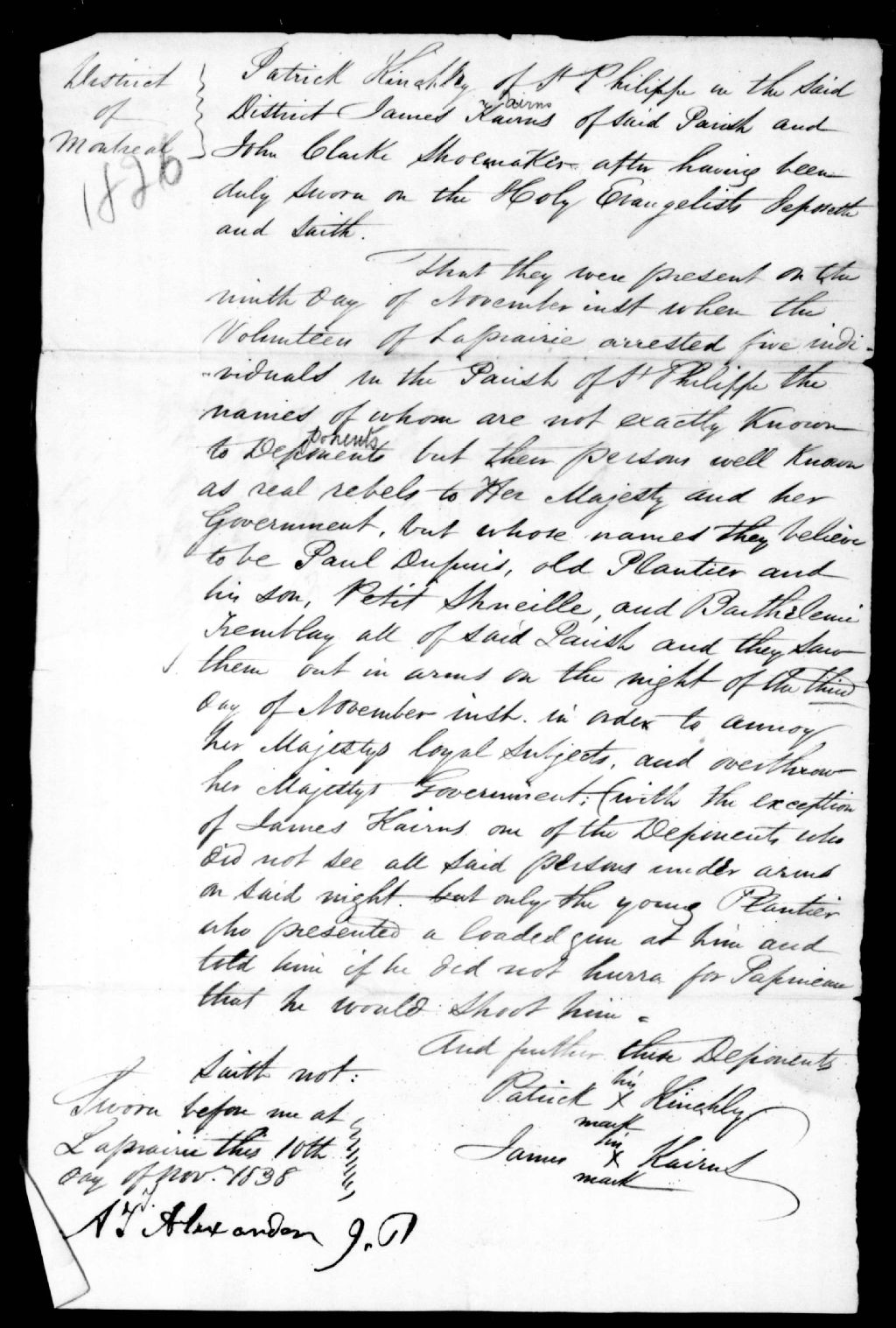 Déposition de John Clarke, cordonnier, de Saint-Philippe, Patrick Hinchley, de Saint-Philippe et John Cairns, de Saint-Philippe, 10 novembre 1838, Archives nationales à Québec, Fonds Ministère de la Justice, (03Q,E17,S37,D1826).