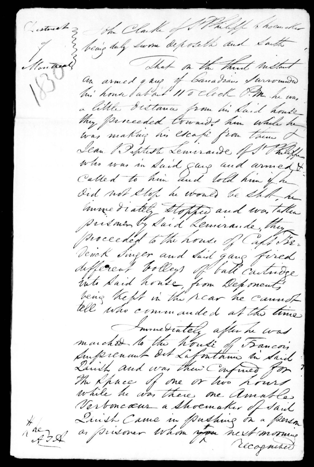 Déposition de John Clarke, cordonnier, de Saint-Philippe, contre Jean-Baptiste Lamirande, de Saint-Philippe, François Suprenant dit Lafontaine, de Saint-Philippe, Amable Vadeboncoeur, de Saint-Philippe et Hubert Lefebvre