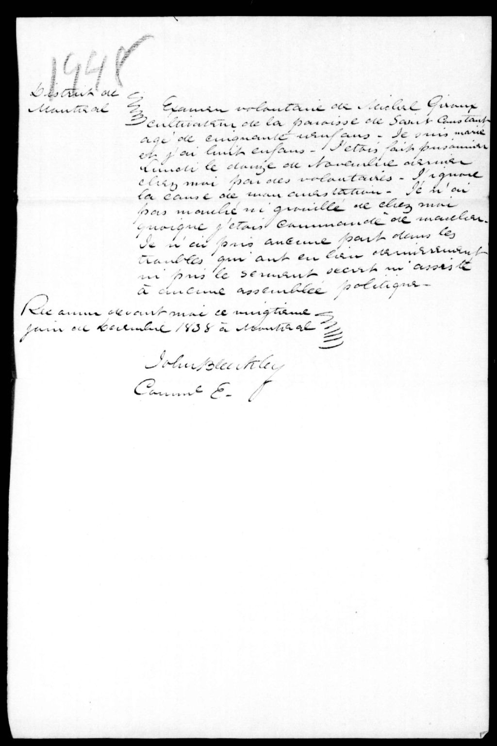 Examen de Michel Giroux, de Saint-Constant, 20 décembre 1838, Archives nationales à Québec, Fonds Ministère de la Justice, (03Q,E17,S37,D1948).