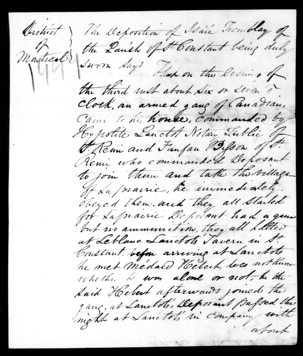 - Déposition d'Isaïe Tremblay, de Saint-Constant, contre Hippolyte Lanctôt, notaire, Fanfan Bisson et Médard Hébert