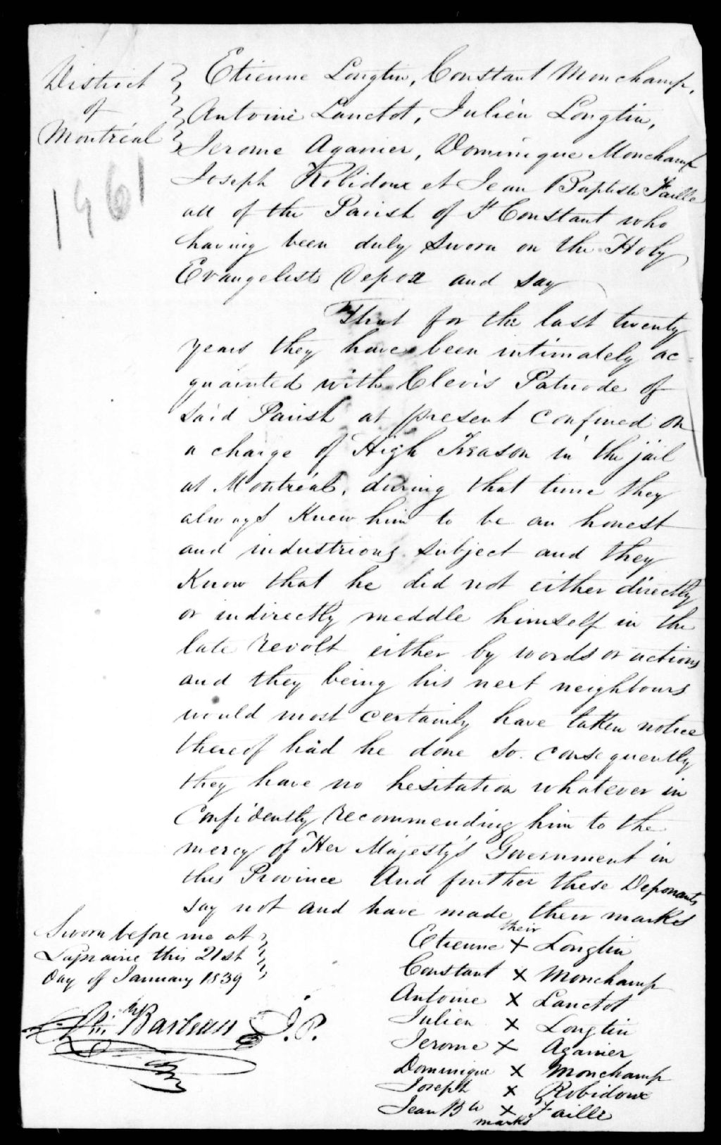 Dépositions de plusieurs citoyens de Saint-Constant en faveur de Clovis Patenaude, de Saint-Constant, 21 janvier 1839, Archives nationales à Québec, Fonds Ministère de la Justice, (03Q,E17,S37,D1961).