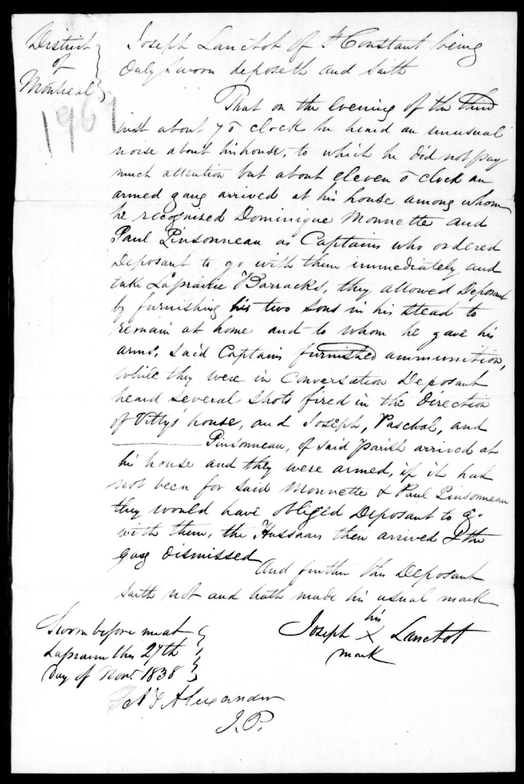 Déposition de Joseph Lanctôt, de Saint-Constant, contre Dominique Monette et Paul Pinsonnault