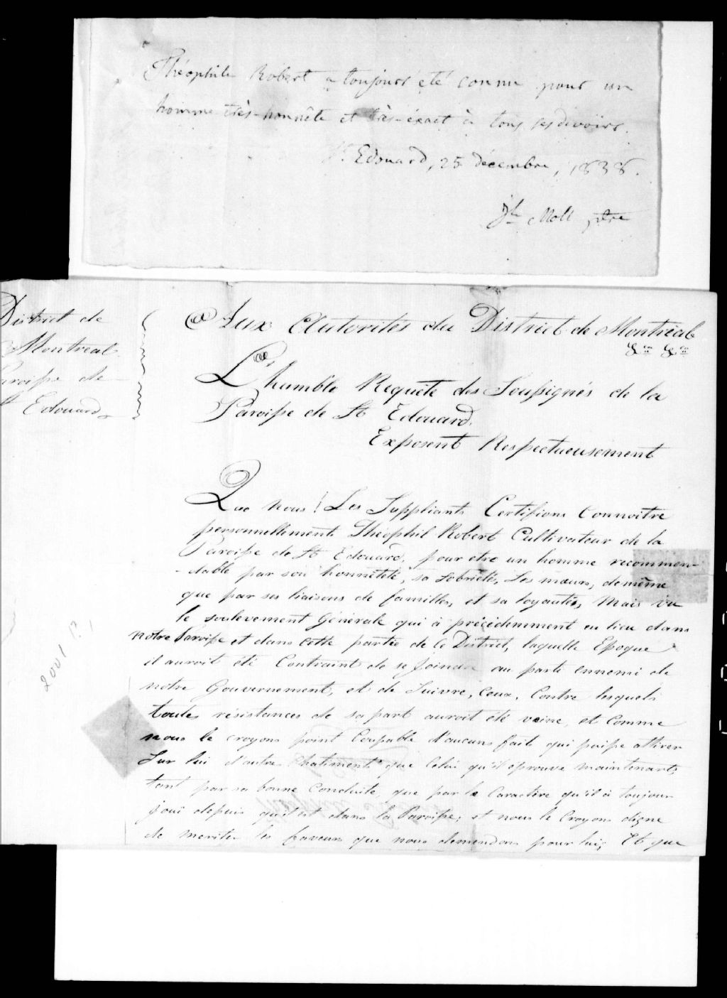 - Requête de plusieurs citoyens de Saint-Édouard-de-Napierville aux autorités du district de Montréal, en faveur de Théophile Robert