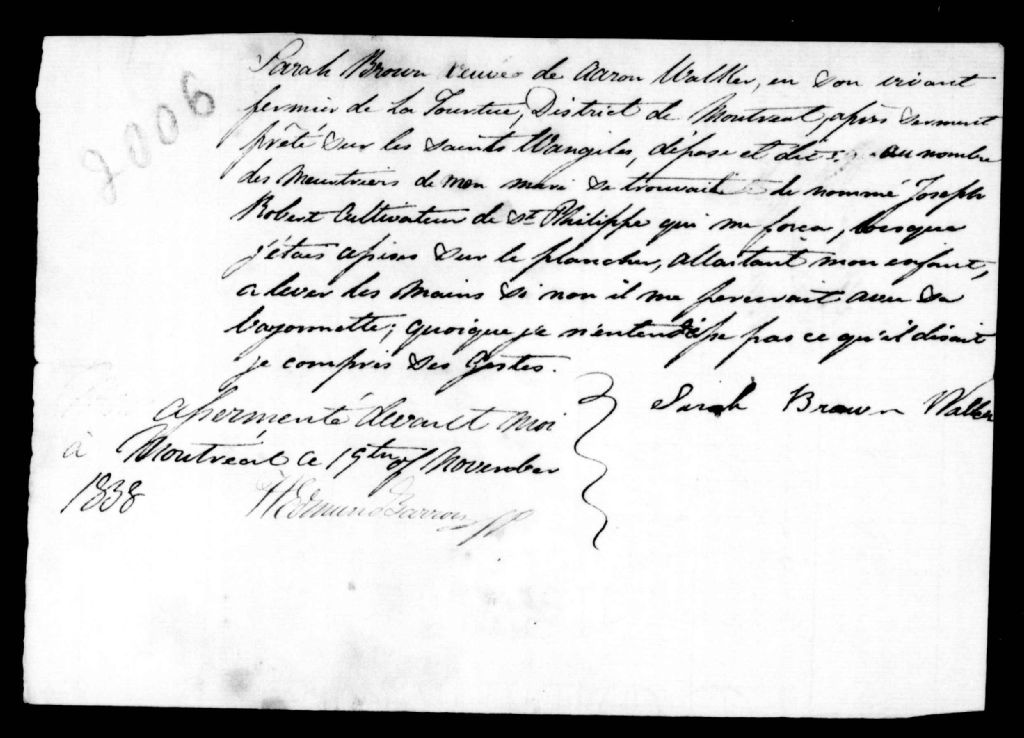 Déposition de Sarah Brown, veuve d'Aaron Walker, contre Joseph Robert