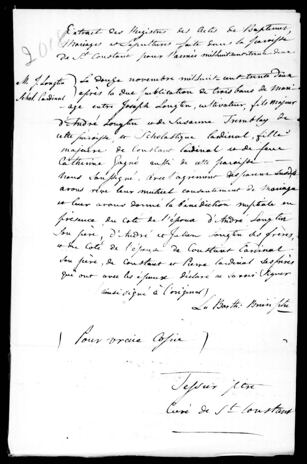 Copie de l'acte de mariage de Joseph Longtin, fils d'André Longtin, 1832, Archives nationales à Québec, Fonds Ministère de la Justice, (03Q,E17,S37,D2018).
