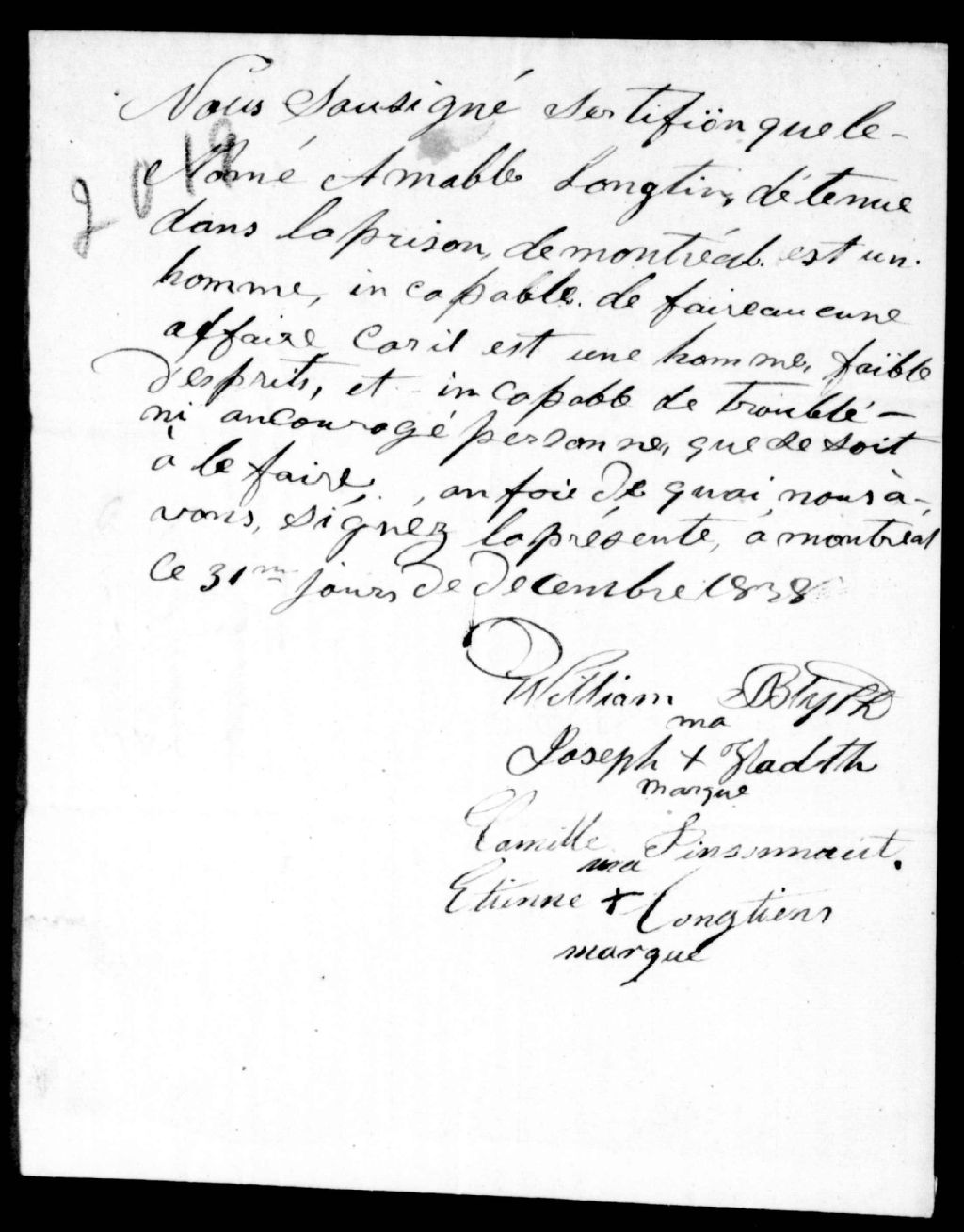 Certificat de loyauté en faveur d'Amable Longtin, 31 décembre 1838, Archives nationales à Québec, Fonds Ministère de la Justice, (03Q,E17,S37,D2019).
