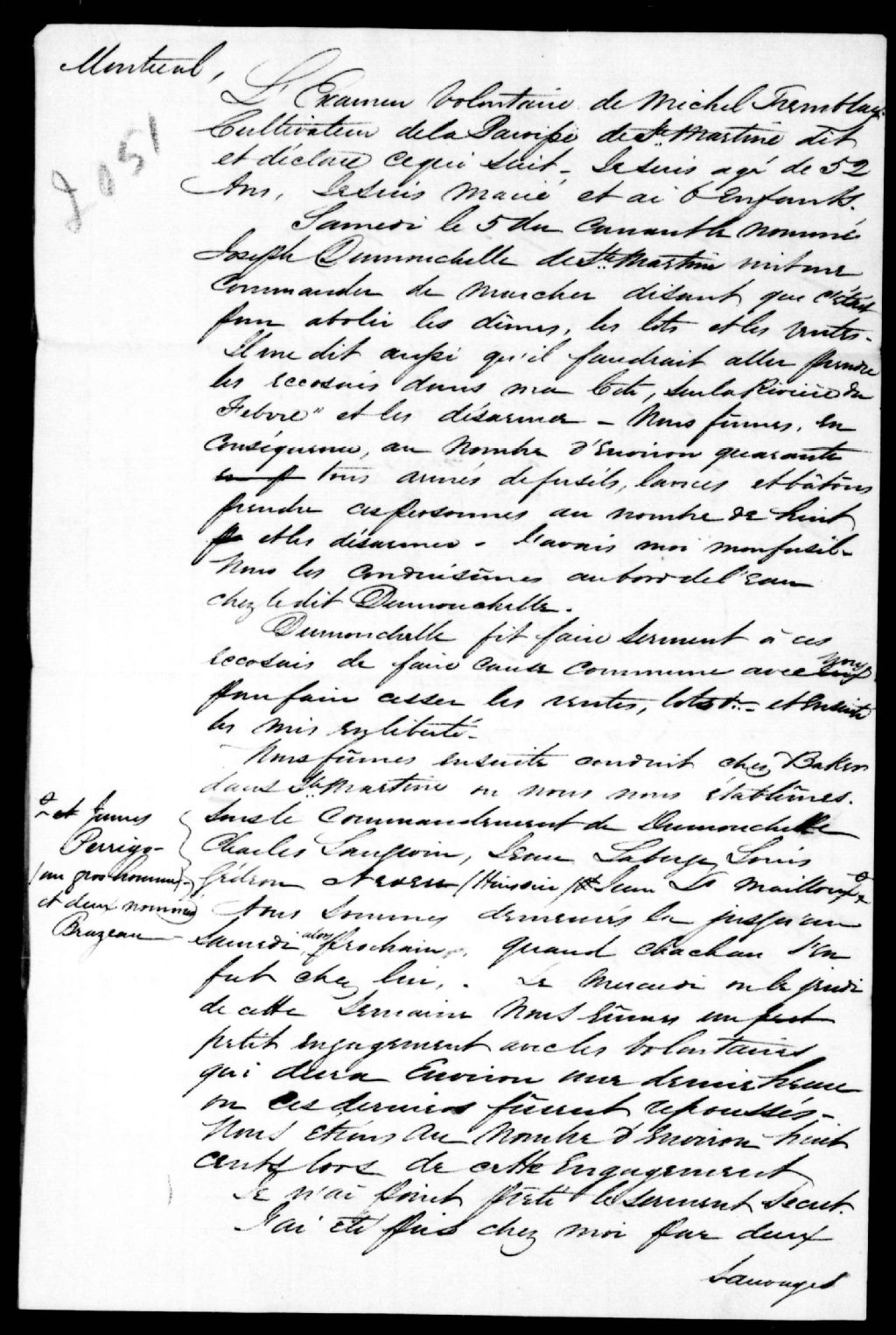 - Les dépositions depuis le numéro 2035 jusqu'au numéro 2079 sont contre les personnages dont les noms suivent: James Perrigo, François-Xavier Prieur, chevalier de Lorimier, Jean-Baptiste-Henri Brien, Joseph Dumouchelle, Louis Dumouchelle, Louis Hunault, Charles Rapin, Louis Turcotte, Jean Laberge, Joseph Wattier dit Lanoix, François Desgroseilliers, Louis Vallée, Antoine Charbonneau, Toussaint Rochon, Étienne Hunault, Charles Sanfaçon (Sansfaçon), Gédéon Neveu, André Papineau dit Montigny, Louis Trudel, Noël Lefebvre, Toussaint Gagnon, Louis Julien. Les examens volontaires mettent souvent en cause les mêmes personnes. Ce dossier fait partie d'un ensemble de documents intitulé : Assassinat d"Aaron Walker. Beauharnois
