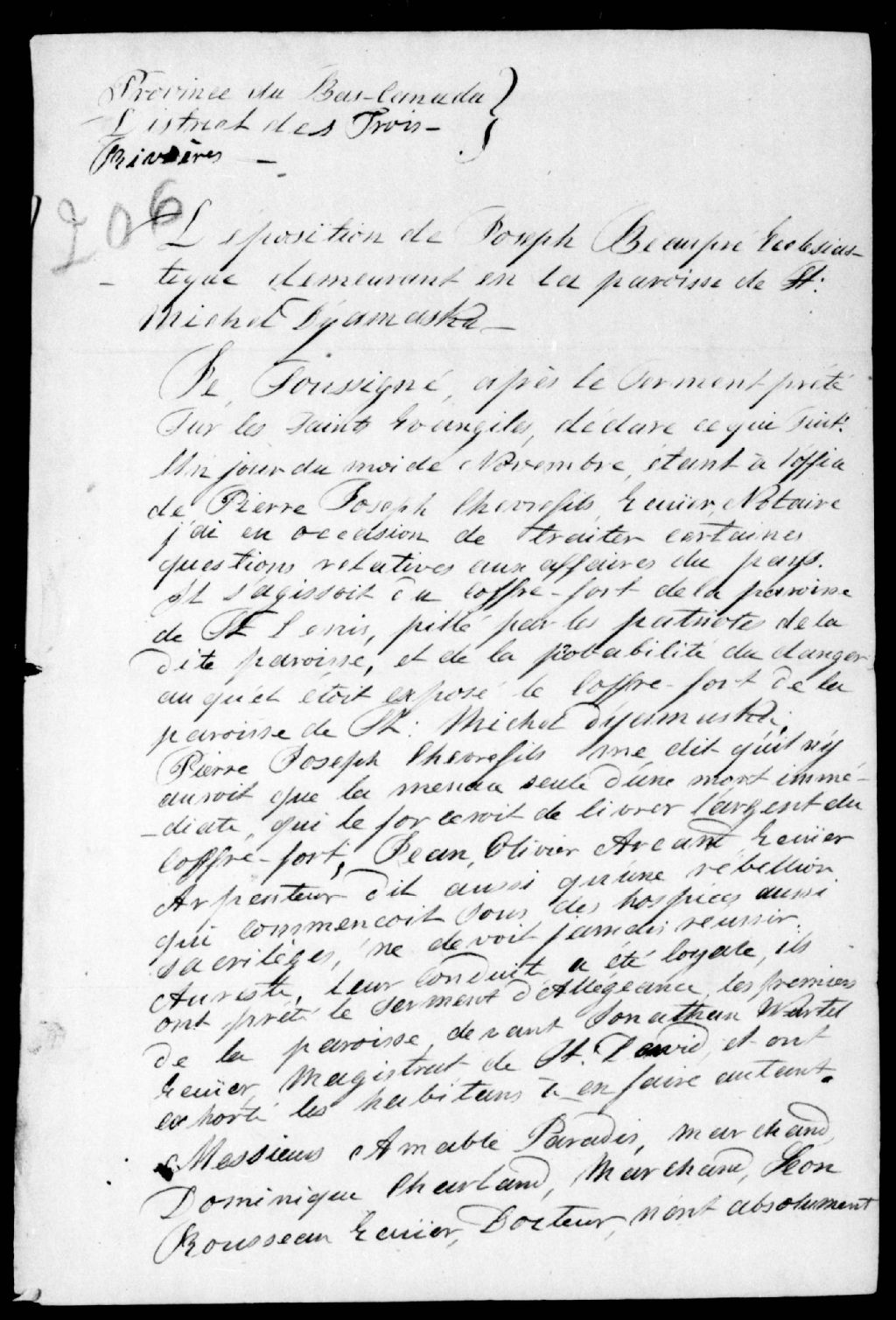 Affidavit de Joseph Beaupré, ecclésiastique, en faveur de Joseph Chevrefils, Jean-Olivier Arcand, Amable Paradis et autres