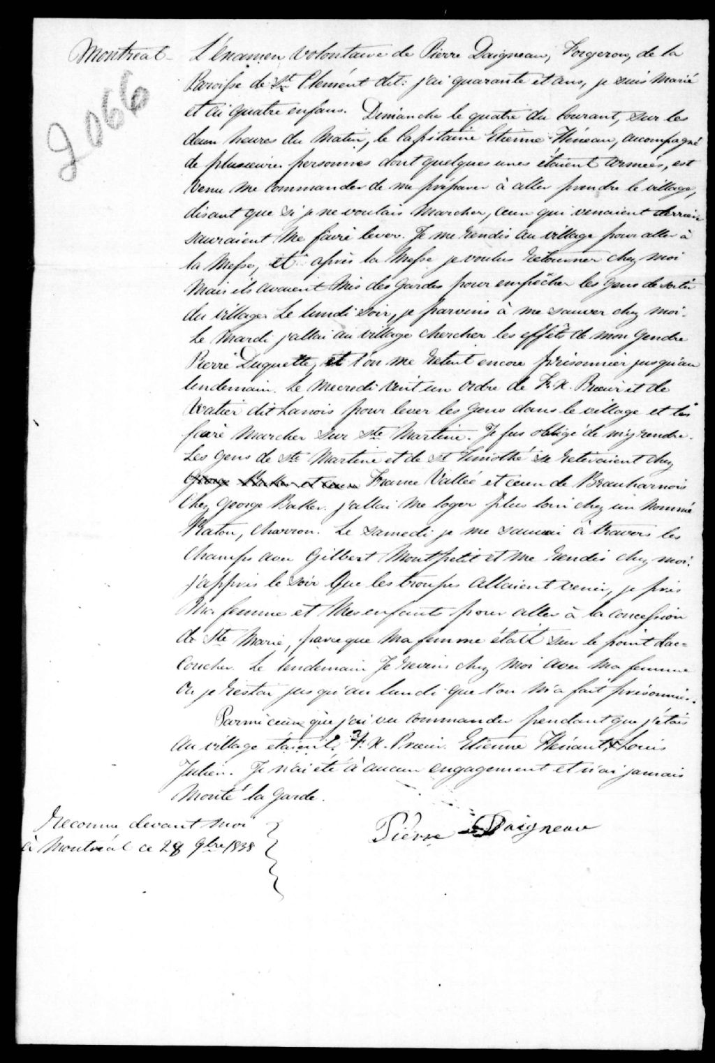 Examen de Pierre Dagneau, 28 novembre 1838, Archives nationales à Québec, Fonds Ministère de la Justice, (03Q,E17,S37,D2066).