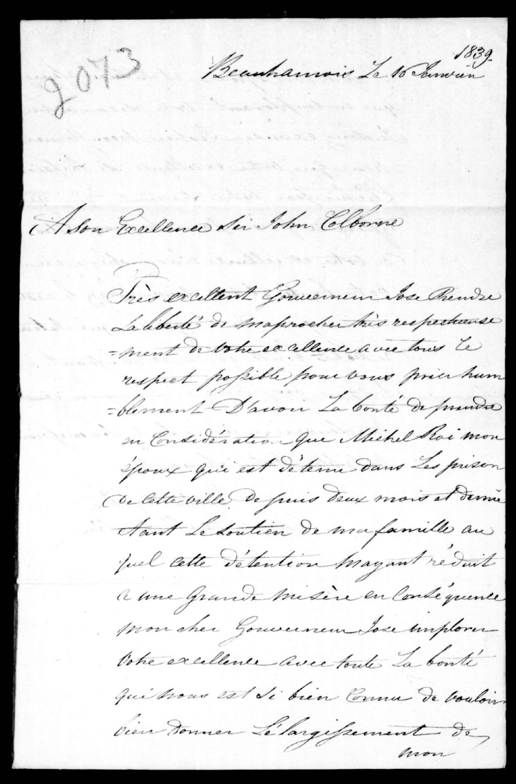 Requête de Josette Lefebvre, épouse de Michel Roy, de Beauharnois, à sir John Colborne, 16 janvier 1839, Archives nationales à Québec, Fonds Ministère de la Justice, (03Q,E17,S37,D2073).