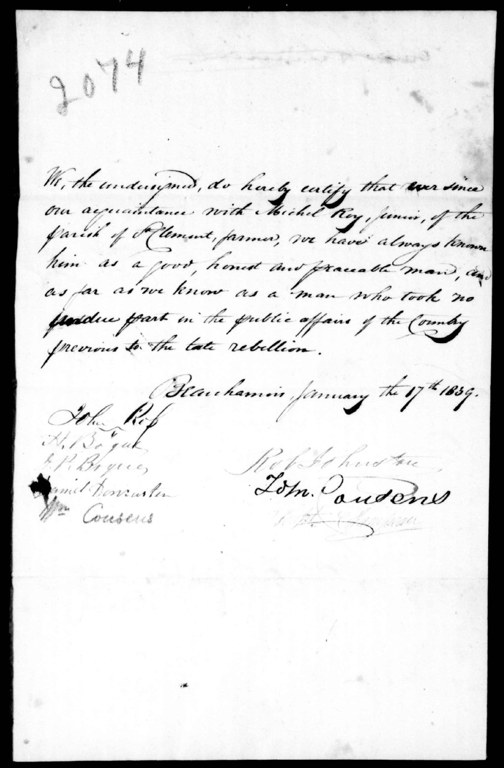 Certificat de plusieurs citoyens de Beauharnois, en faveur de Michel Roy, 17 janvier 1839, Archives nationales à Québec, Fonds Ministère de la Justice, (03Q,E17,S37,D2074).