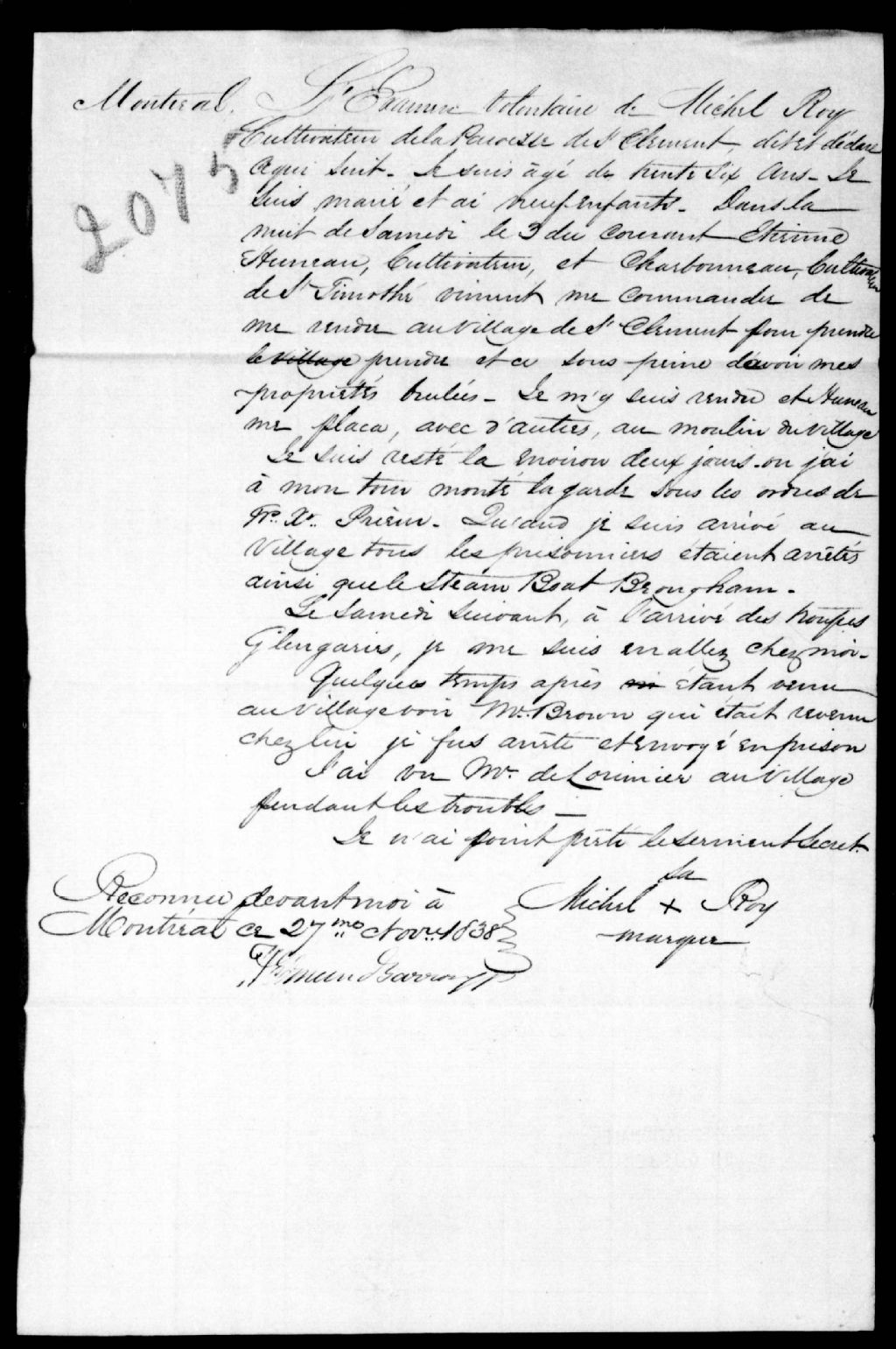 - Les dépositions depuis le numéro 2035 jusqu'au numéro 2079 sont contre les personnages dont les noms suivent: James Perrigo, François-Xavier Prieur, chevalier de Lorimier, Jean-Baptiste-Henri Brien, Joseph Dumouchelle, Louis Dumouchelle, Louis Hunault, Charles Rapin, Louis Turcotte, Jean Laberge, Joseph Wattier dit Lanoix, François Desgroseilliers, Louis Vallée, Antoine Charbonneau, Toussaint Rochon, Étienne Hunault, Charles Sanfaçon (Sansfaçon), Gédéon Neveu, André Papineau dit Montigny, Louis Trudel, Noël Lefebvre, Toussaint Gagnon, Louis Julien. Les examens volontaires mettent souvent en cause les mêmes personnes. Ce dossier fait partie d'un ensemble de documents intitulé : Assassinat d"Aaron Walker. Beauharnois
