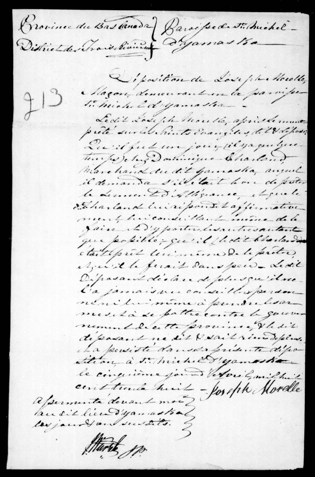 - Affidavit de Joseph Morelle, de Saint-Michel-d'Yamaska, en faveur de Dominique Charland
