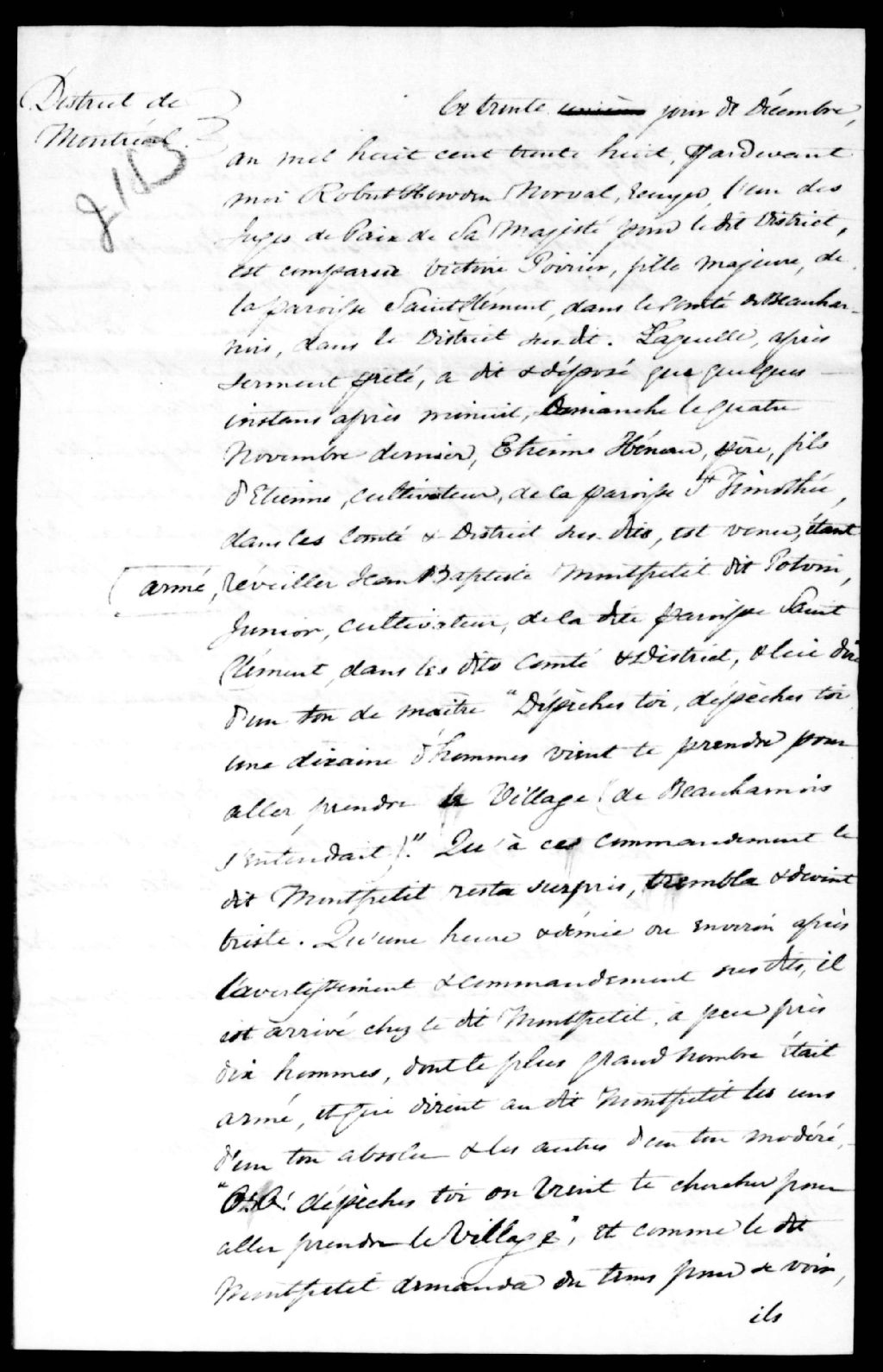 Déposition en faveur d'Étienne Montpetit dit Potvin, de Beauharnois, par Victoire Poirier, 30 décembre 1838, Archives nationales à Québec, Fonds Ministère de la Justice, (03Q,E17,S37,D2183).