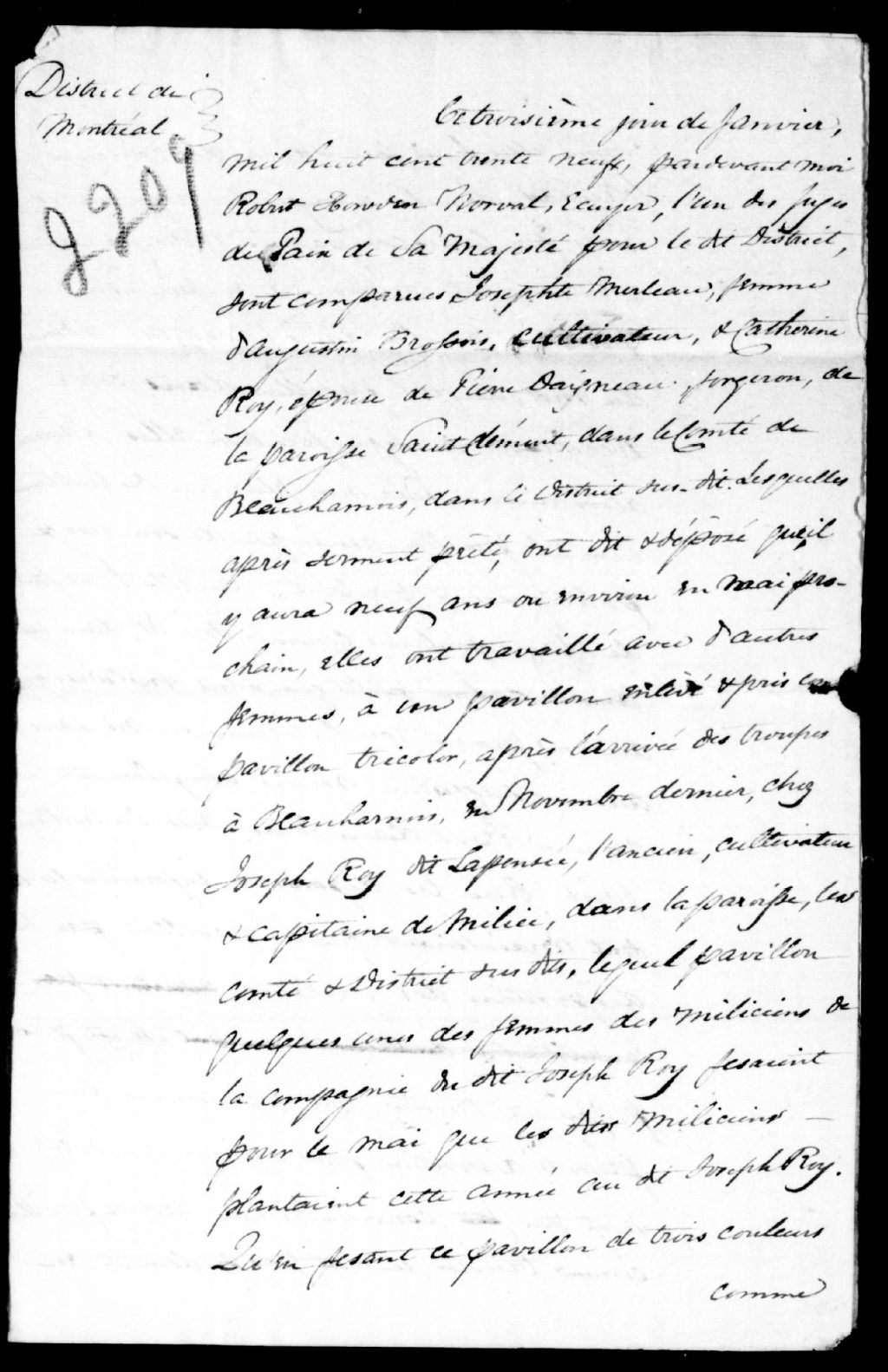 - Déposition de Josephte Merleau, épouse d'Augustin Brossois, et de Catherine Roy, épouse de Pierre Dagneau en faveur de Joseph Roy dit Lapensée, de Beauharnois