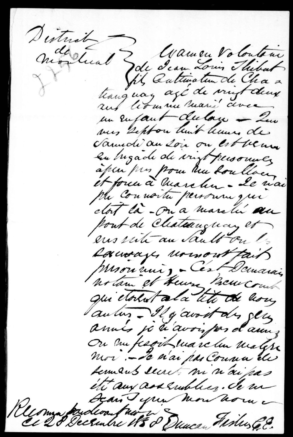 - Les dépositions suivantes, du numéro 2242 au numéro 2275, sont contre les personnes dont les noms suivent: Joseph Duquette, Joseph-Narcisse Cardinal, Maurice Lepailleur, Henri Newcomb, Jean-Marie Thibert, Jean-Baptiste Lefebvre, Abraham Desmarais, Samuel Newcomb, Léandre Ducharme, François Graveline, Charles Dewitt, Louis Lesage dit Laviolette, Registre Samson, Louis Siscoe et Louis Meloche. Les examens volontaires mettent aussi en cause les mêmes personnages. Ce dossier fait partie d'un ensemble de documents intitulé : Châteauguay. Expédition chez les Sauvages du Sault-Saint-Louis