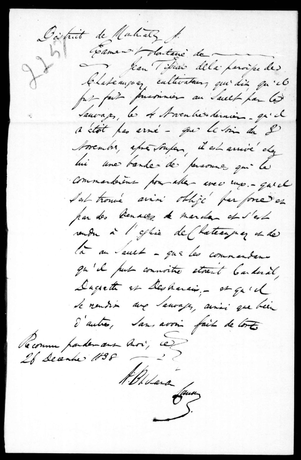 - Les dépositions suivantes, du numéro 2242 au numéro 2275, sont contre les personnes dont les noms suivent: Joseph Duquette, Joseph-Narcisse Cardinal, Maurice Lepailleur, Henri Newcomb, Jean-Marie Thibert, Jean-Baptiste Lefebvre, Abraham Desmarais, Samuel Newcomb, Léandre Ducharme, François Graveline, Charles Dewitt, Louis Lesage dit Laviolette, Registre Samson, Louis Siscoe et Louis Meloche. Les examens volontaires mettent aussi en cause les mêmes personnages. Ce dossier fait partie d'un ensemble de documents intitulé : Châteauguay. Expédition chez les Sauvages du Sault-Saint-Louis
