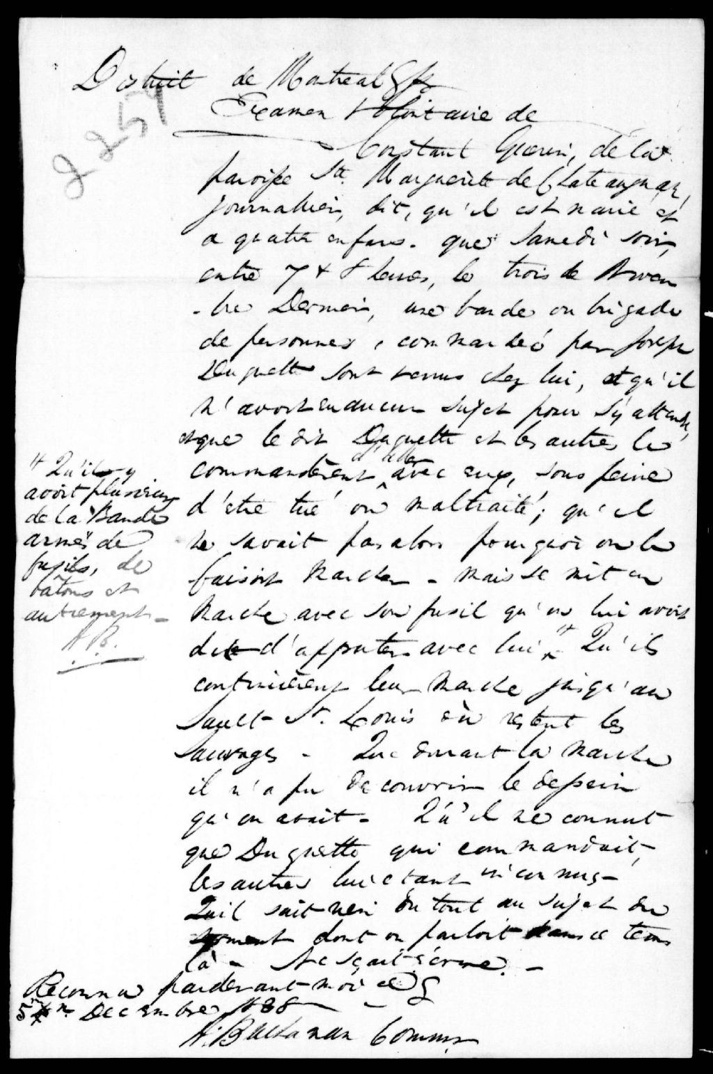 Examen de Constant Guérin, 5 décembre 1838, Archives nationales à Québec, Fonds Ministère de la Justice, (03Q,E17,S37,D2259).