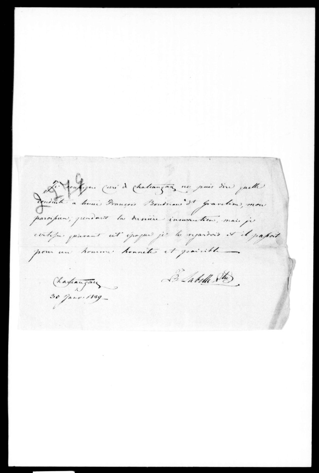Certificat de messire B. Labelle, prêtre, curé de Châteauguay, en faveur de François Boudreau dit Graveline, 20 janvier 1839, Archives nationales à Québec, Fonds Ministère de la Justice, (03Q,E17,S37,D2279).