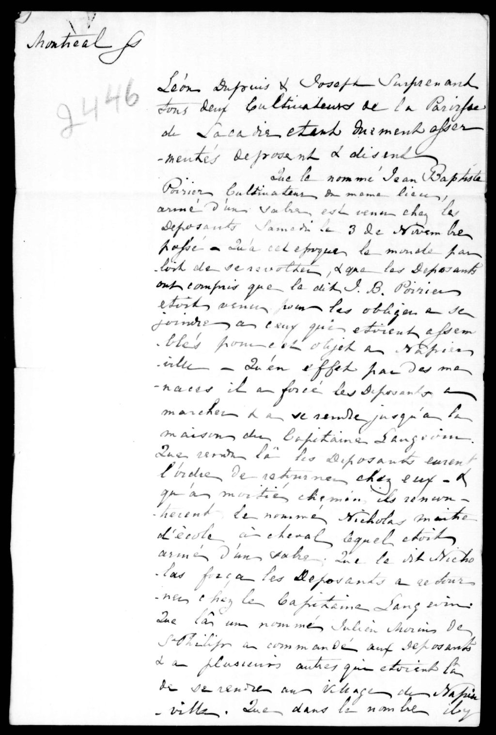 Déposition de Léon Dupuis et de Joseph Surprenant, 3 décembre 1838, Archives nationales à Québec, Fonds Ministère de la Justice, (03Q,E17,S37,D2446).