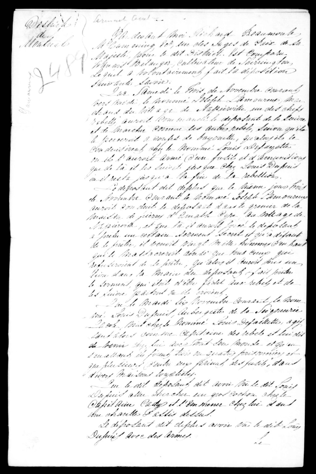 - Déposition de François Bélanger contre Joseph Lamoureux, Louis Defaillette, Joseph Paré, Amable Barrette et plusieurs autres