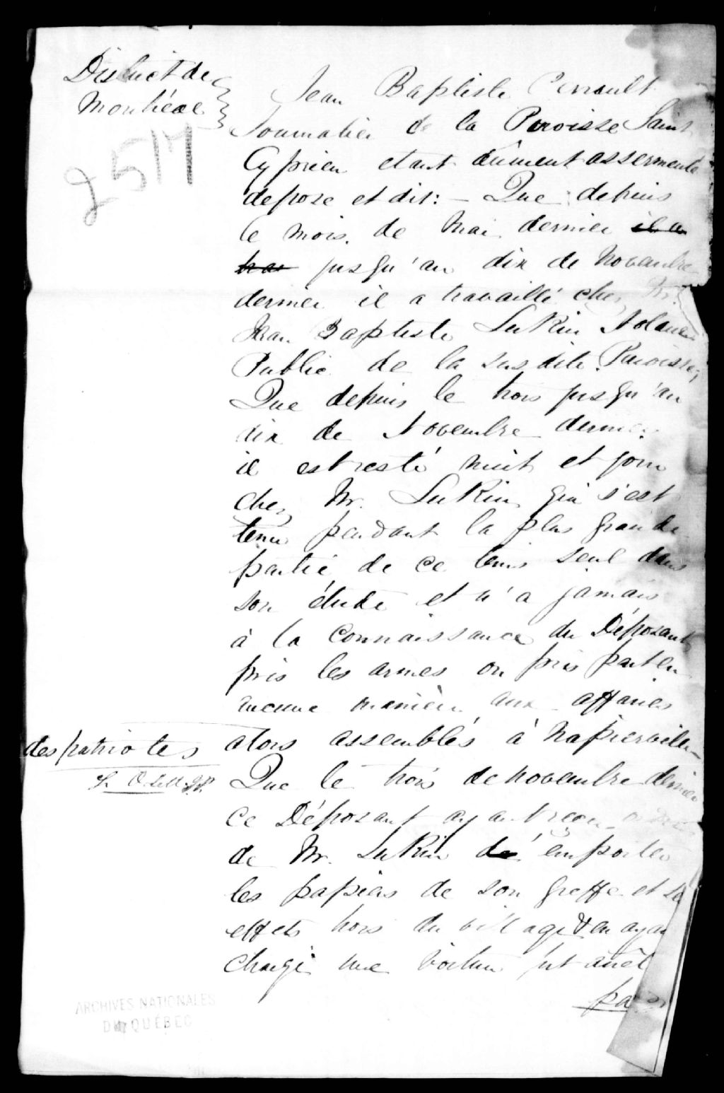 Déposition de Jean-Baptiste Perrault en faveur de Jean-Baptiste Lukin, notaire, de Saint-Cyprien-de-Napierville