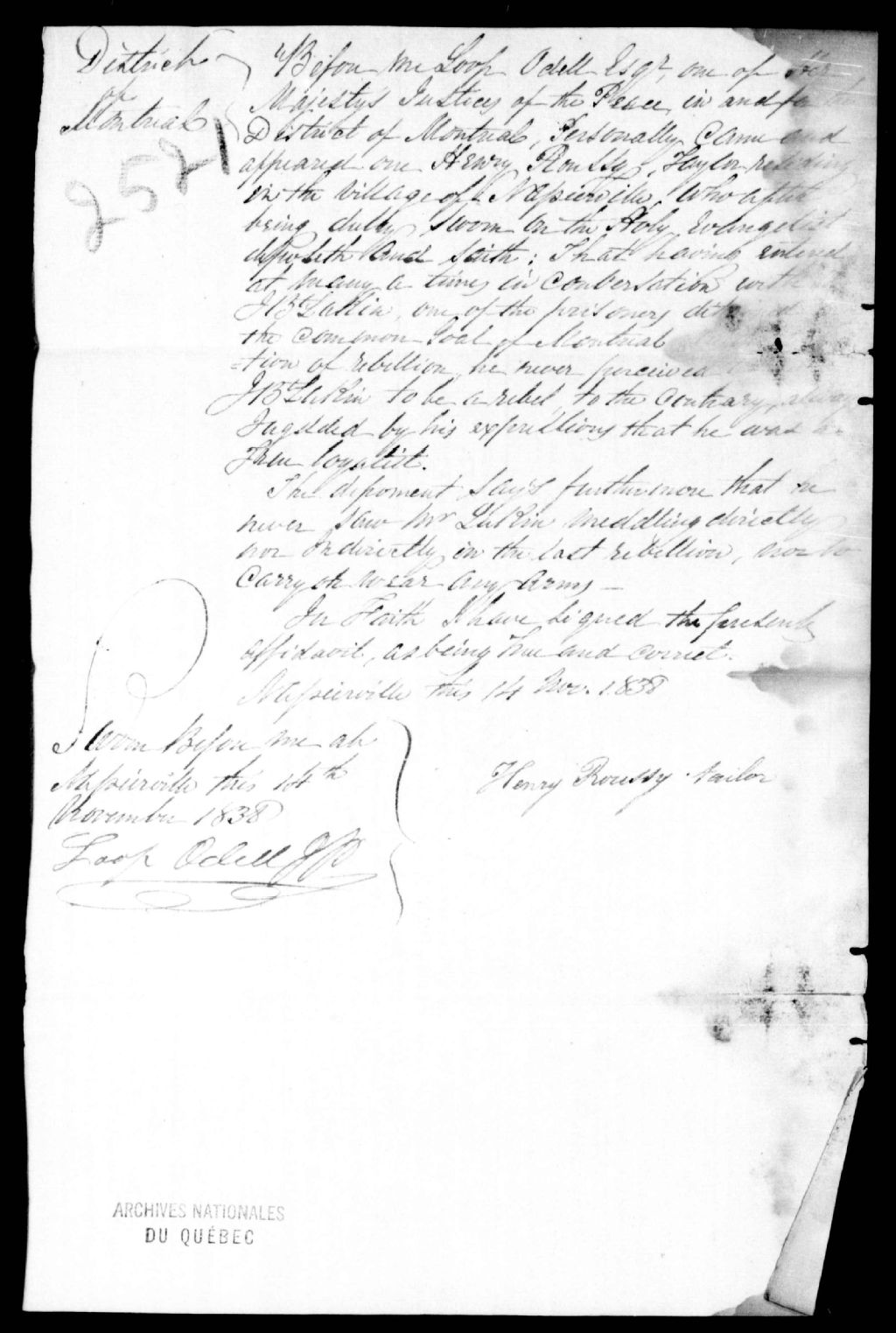 Déposition d'Henry Roussy en faveur de Jean-Baptiste Lukin, notaire, de Saint-Cyprien-de-Napierville, 14 novembre 1838, Archives nationales à Québec, Fonds Ministère de la Justice, (03Q,E17,S37,D2521).