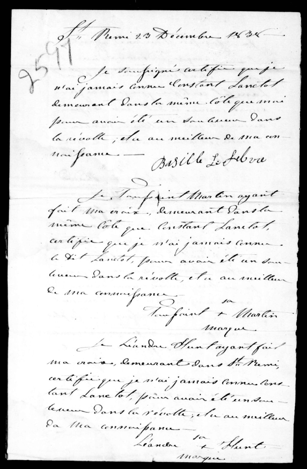 Certificat de Basile Lefebvre, Toussaint Martin, Léandre Hunt, Joseph Bédard et T. Bédard, prêtre, en faveur de Constant Lanctôt, 23 décembre 1838, Archives nationales à Québec, Fonds Ministère de la Justice, (03Q,E17,S37,D2597).