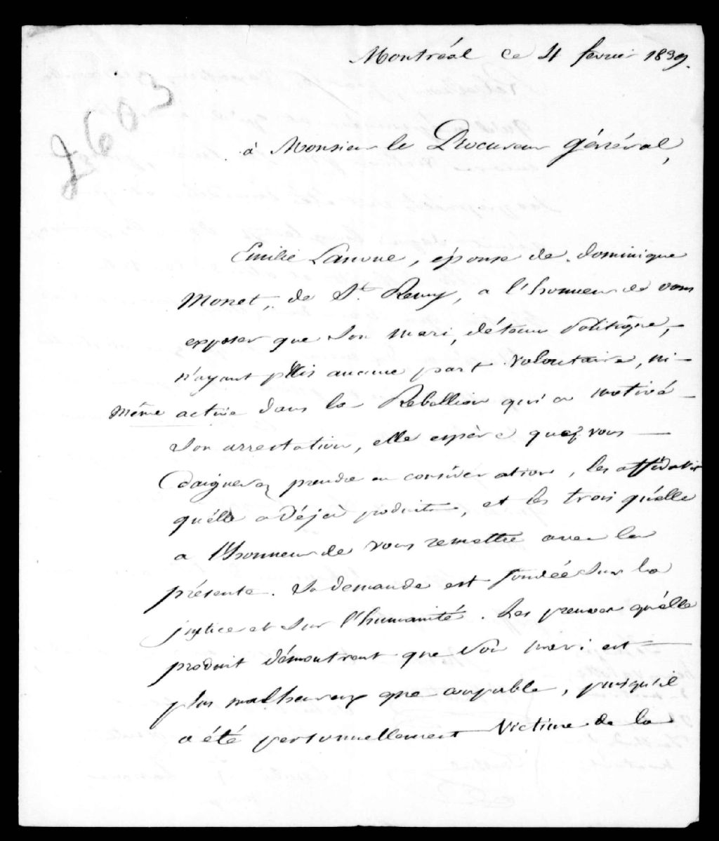- Requête d'Emélie Lanoue, épouse de Dominique Monette, au procureur général