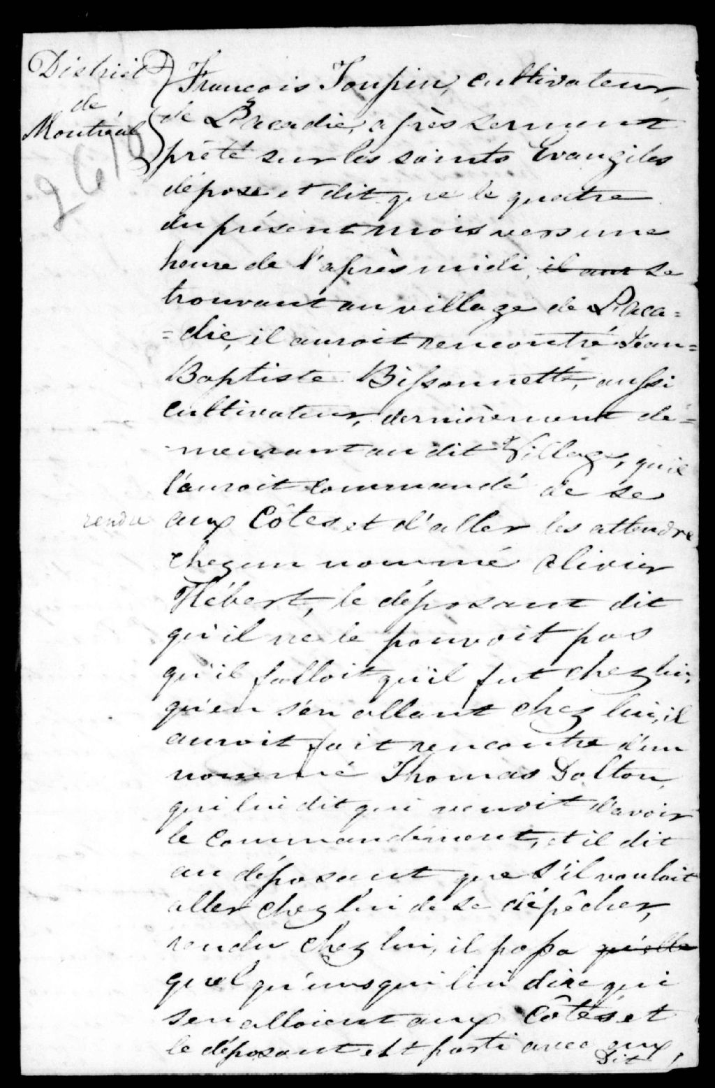 Déposition de François Toupin contre Jean-Baptiste Bissonnette et Joseph Paré